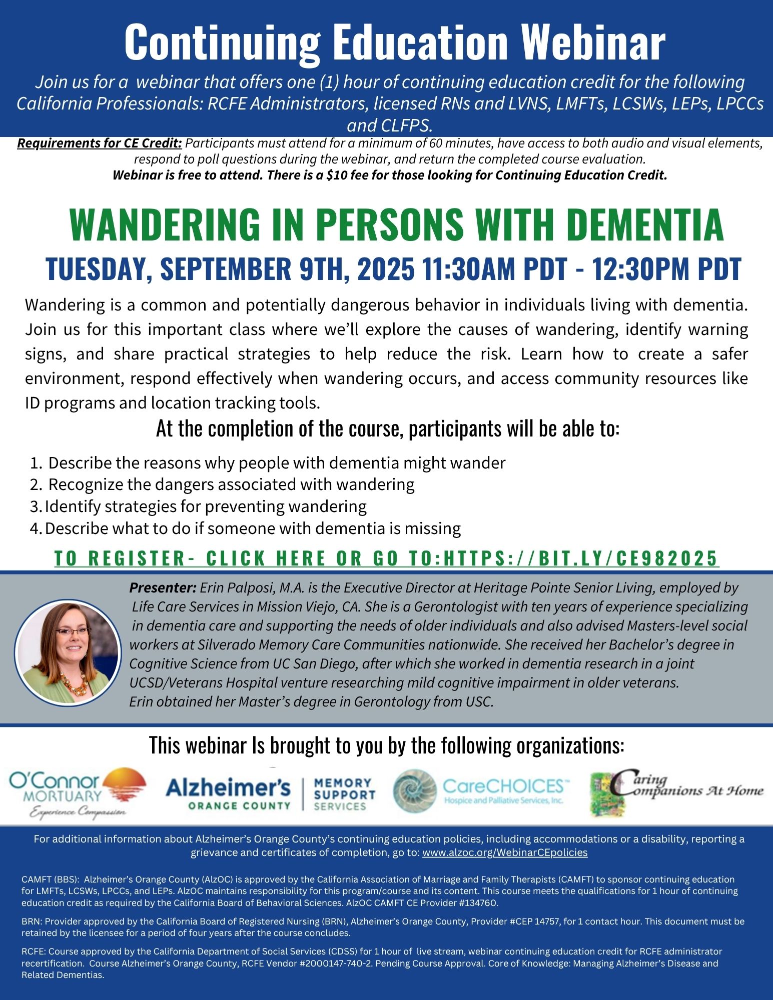 Executive Director Erin Palposi is presenting an educational webinar, hosted by Alzheimer’s Orange County. Wandering is a common and potentially dangerous behavior in individuals living with dementia. Join